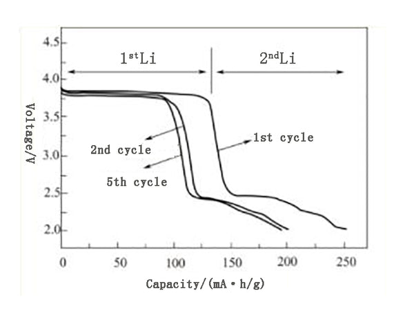 When charged at 0.2C at about 23°C, its charging specific capacity is 135mA·h/g (theoretical specific capacity 156mA·h/g), which is equivalent to There are 0.87 lithium ions in the molecule of compound LiVPO4F; and there is a reversible discharge specific capacity of 115mA·h/g, which is equivalent to the discharge specific capacity of Li1-xVPO4F (x=0.74); in LiVPO4F, lithium ions are released /Intercalation is related to the V3+/V4+ redox couple, and V3+ and V4+ of vanadium are stable oxidation states, namely