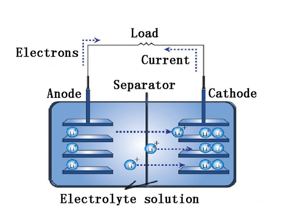When the battery is discharged, the lithium atoms of the negative electrode lose electrons to form lithium ions. The lost electrons are attracted by the positive electrode's electric field and enter the positive electrode through the external circuit. The negative electrode generates lithium ions by diffusion and enters the electrolyte. The ClO4- in the positive electrode PAn enters the electrolyte. When the battery is charged, ClO4-doped into PAn, the lithium ions in the electrolyte are reduced to metallic lithium, which is deposited on the lithium negative electrode, and electrons flow from the positive electrode to the negative electrode through the external circuit.